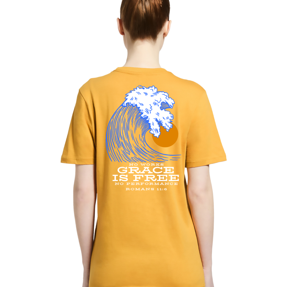 On the front, a simple shell hits the left chest with “Grace is Free.”