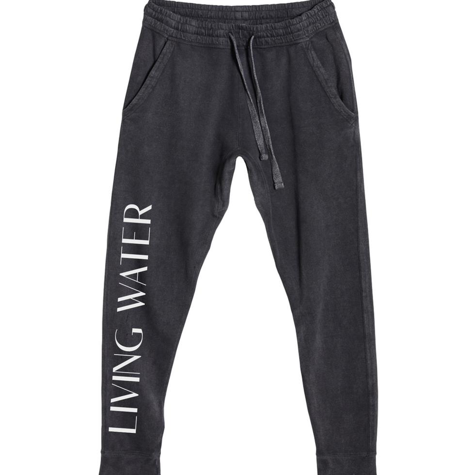 Where style meets substance — these vintage-washed joggers feature “Living Water” running vertically up the front right leg, a bold reminder of the source that never runs dry. On the back pocket, the Living Water Clothing logo adds a subtle but meaningful signature.